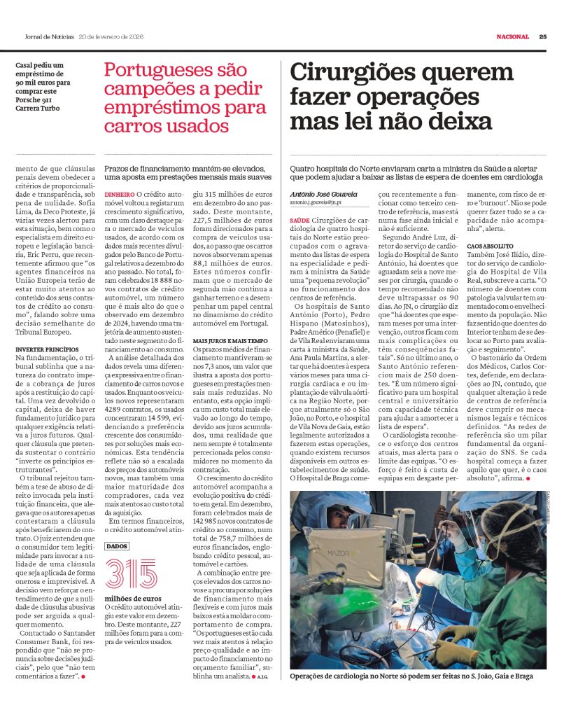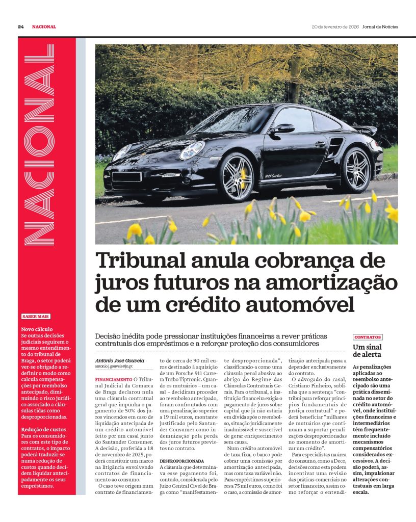 A notícia, publicada na edição de 20 de fevereiro de 2026, detalha o caso de um casal que, ao pretender amortizar o crédito de uma viatura de alta gama, foi confrontado com uma penalização superior a 19 mil euros. O Tribunal, acolhendo a nossa tese, considerou tal exigência “manifestamente desproporcionada”.